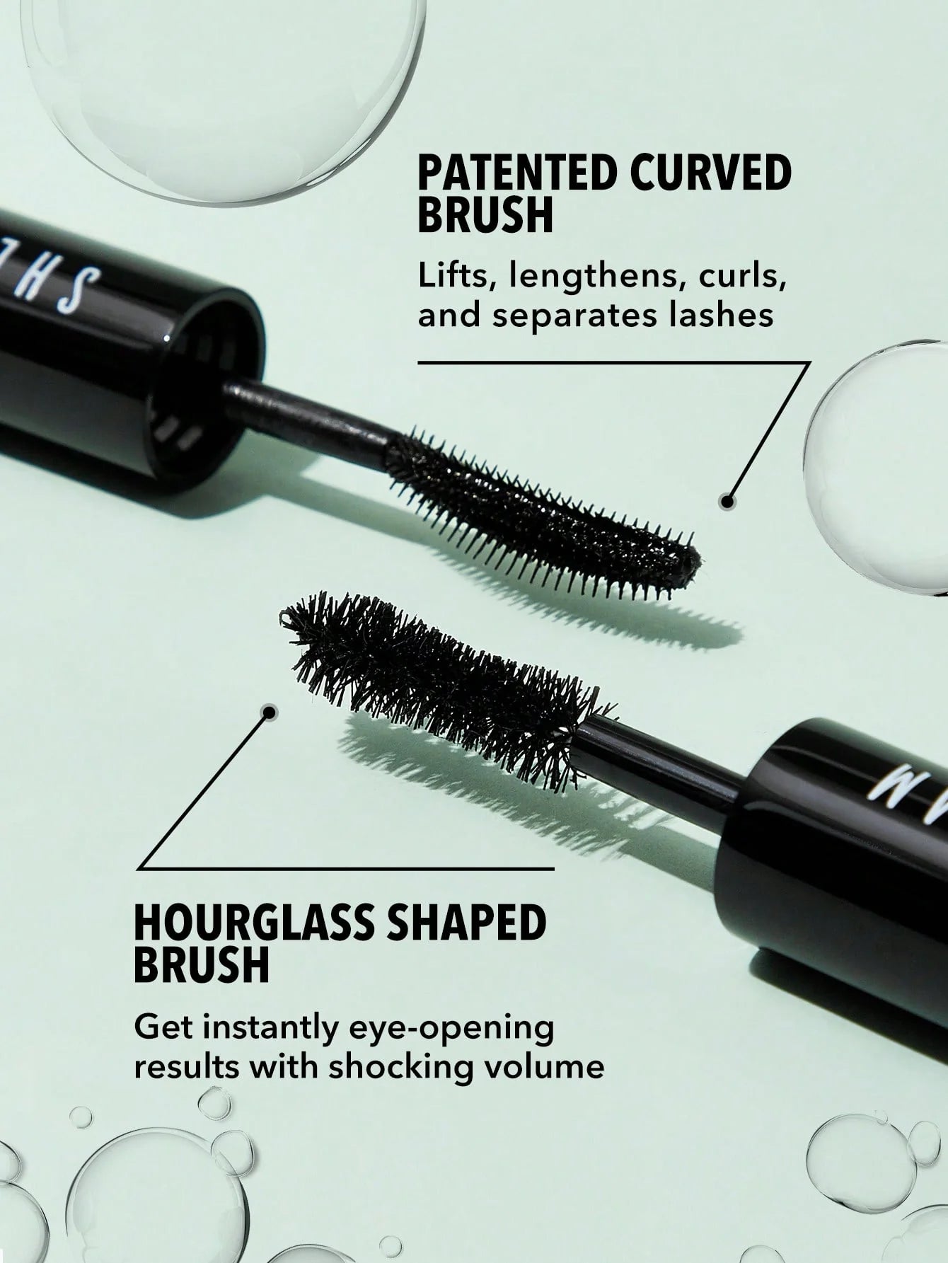 Brush 1: Lifted and Luscious Eyelashes Our patented silicone brush has a curved silhouette with nine rows of bristles and two loading arches. It’s designed to perfectly sweep up every last lash – even the tiniest ones. Our volumizing formula glides effortlessly through your eyelashes to create a volumized, lifted, and curled look.